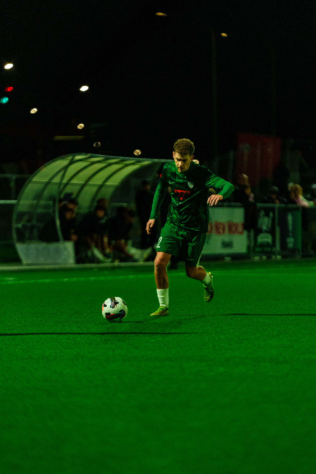 A football player for Bay Olympic FC swings his leg back preparing to strike the football during a game.