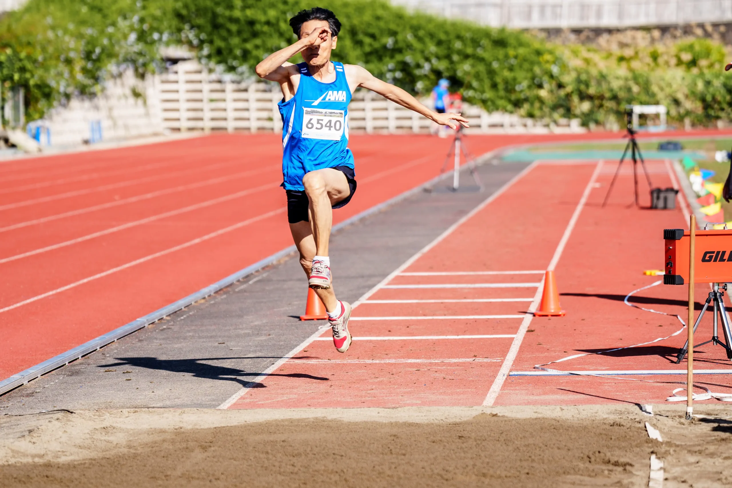 A man obscures his face with his hand as he launches into a triple jump.